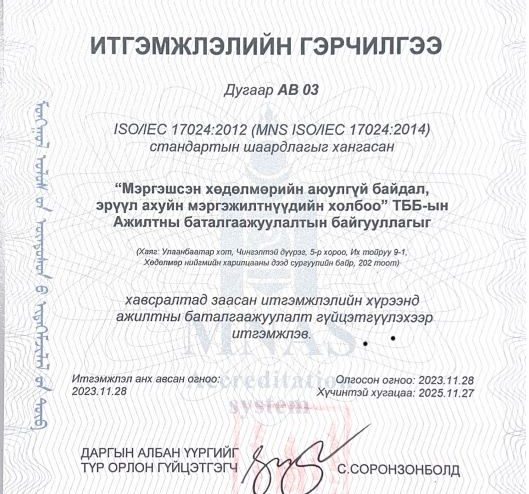 Монгол хүний аюулгүй байдлыг хангахад үндэсний ЗӨВ ТОГТОЛЦООГ бүрдүүлэхэд бид манлайлна. Гамшигийн, Хөдөлмөрийн, Ахуйн аюулгүй байдлын талаар нэгдмэл бодлого, зорилтын төлөө хамтран ажиллана. Эрсдэлд суурилсан сэтгэлгээнд суурилсан монгол үндэсний уламжлалт зан үйлийг хөгжүүлнэ
