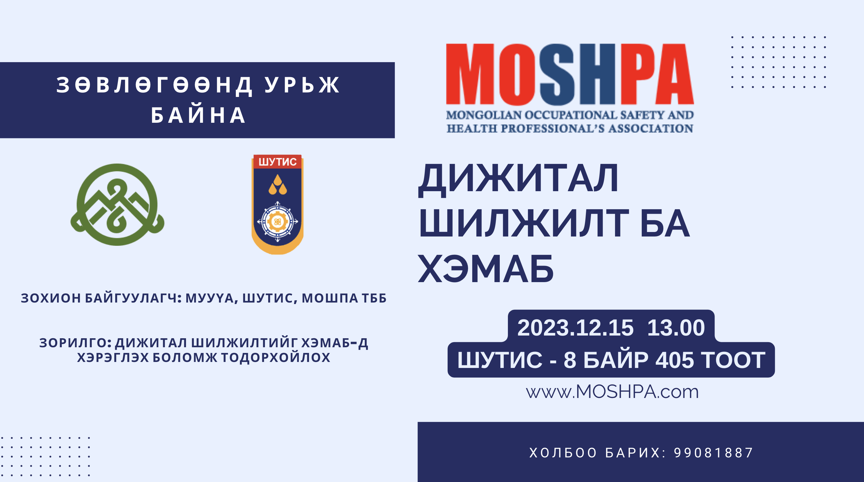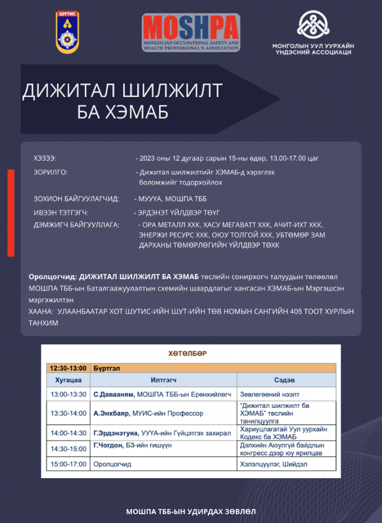29Nov2023 Author Энхзориг Зоригт 0 Comments “Дижитал шилжилт ба ХЭМАБ” Бүртгүүлэх Previous Next Leave a Reply Cancel replyYour email address will not be published. CommentYou may use these <abbr title="HyperText Markup Language">HTML</abbr> tags and attributes: <a href="" title=""> <abbr title=""> <acronym title=""> <b> <blockquote cite=""> <cite> <code> <del datetime=""> <em> <i> <q cite=""> <s> <strike> <strong> Name * Email * Website Save my name, email, and website in this browser for the next time I comment.